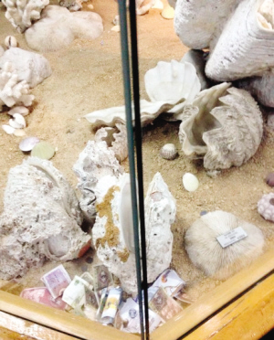 昨天上午,帶著網友們的這些疑問,記者來到了天津自然博物館。只見在海洋展館貝類展廳,分布著六七個玻璃展柜,陳列了不同時期、不同種類的貝類標本,其中三個展柜內,有5處堆積著零錢、硬幣。這些錢都是從展柜玻璃的接縫處兩三毫米的空隙中被塞進去的。其中,最大面值的不過1元,更多的是5角和1角的。除此之外,在一堆堆紙質零錢的四周,還散落著很多一角的硬幣,有的甚至被扔出了近一米遠。“這些錢都是被游客塞進去的,有一個人塞,大家也都跟著塞,錢也就越來越多。”據場館的一位保潔人員說。